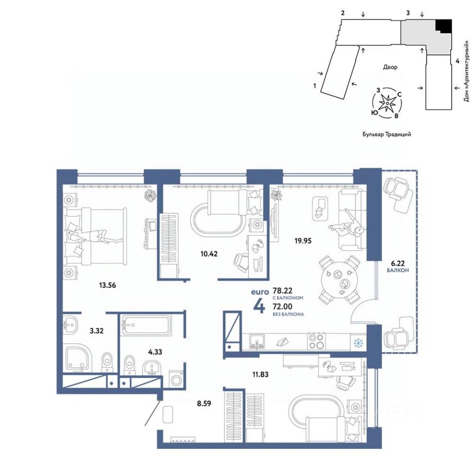 Продается 4комнатная квартира на 4 этаже от застройщика Страна Девелопмент. Площадь квартиры 78,22 кв. м.