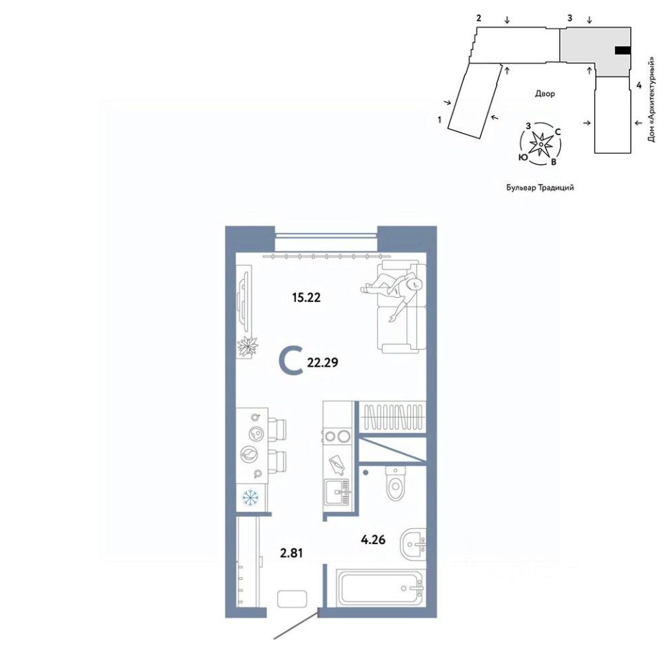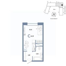 Продается 1комнатная квартира на 5 этаже от застройщика Страна Девелопмент. Площадь квартиры 22,29 кв. м.