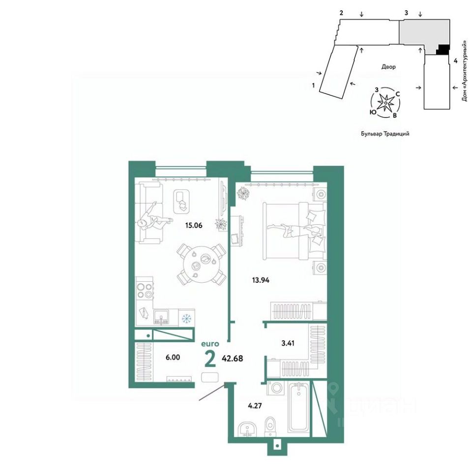 Продается 2комнатная квартира на 10 этаже от застройщика Страна Девелопмент. Площадь квартиры 42,68 кв. м.
