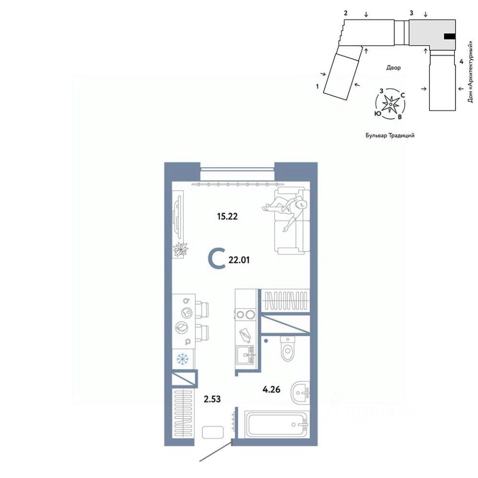 Продается 1комнатная квартира на 12 этаже от застройщика Страна Девелопмент. Площадь квартиры 22,01 кв. м.