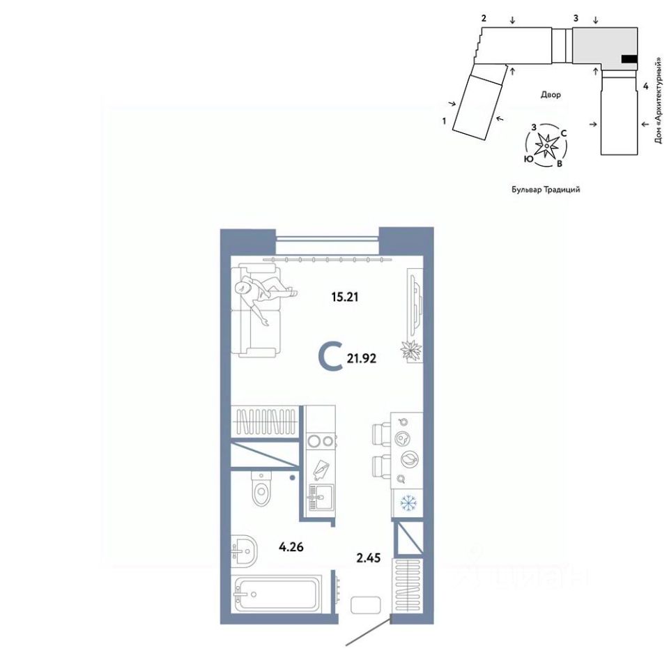 Продается 1комнатная квартира на 12 этаже от застройщика Страна Девелопмент. Площадь квартиры 21,92 кв. м.