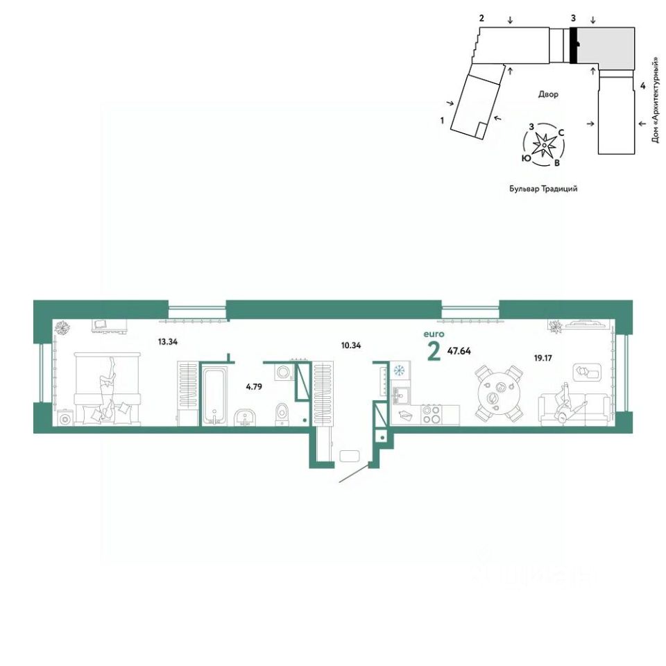 Продается 2комнатная квартира на 14 этаже от застройщика Страна Девелопмент. Площадь квартиры 47,64 кв. м.