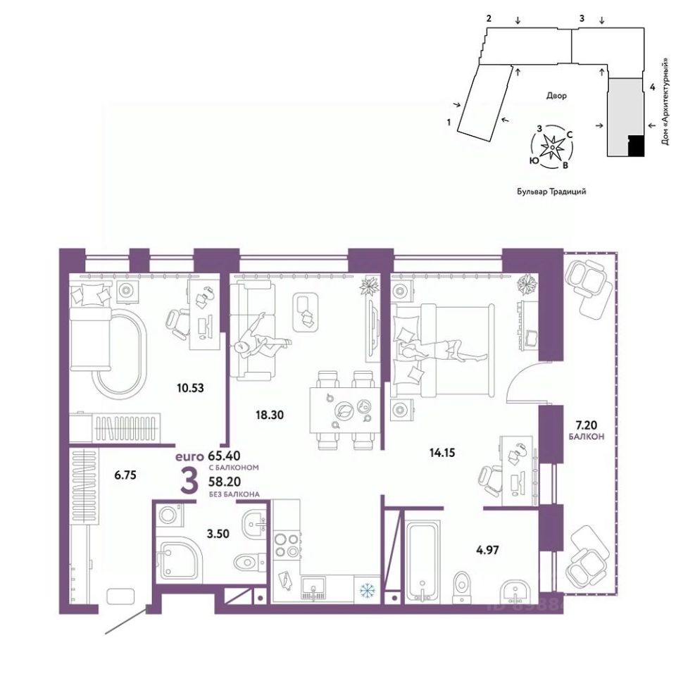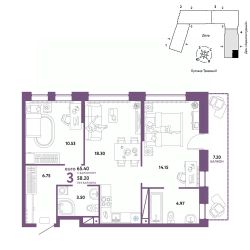 Продается 3комнатная квартира на 4 этаже от застройщика Страна Девелопмент. Площадь квартиры 65,4 кв. м.