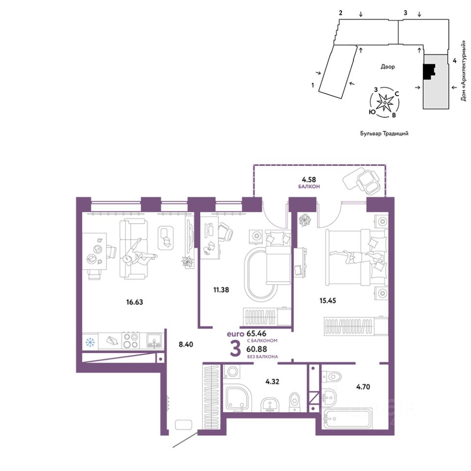 Продается 3комнатная квартира на 4 этаже от застройщика Страна Девелопмент. Площадь квартиры 65,46 кв. м.