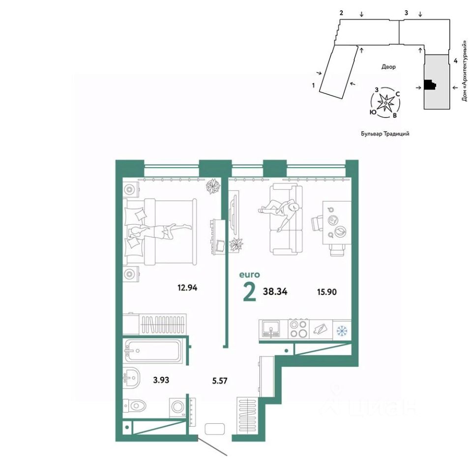Продается 2комнатная квартира на 5 этаже от застройщика Страна Девелопмент. Площадь квартиры 38,34 кв. м.