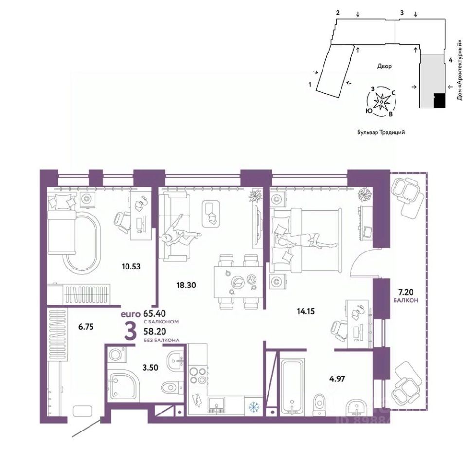 Продается 3комнатная квартира на 8 этаже от застройщика Страна Девелопмент. Площадь квартиры 65,4 кв. м.