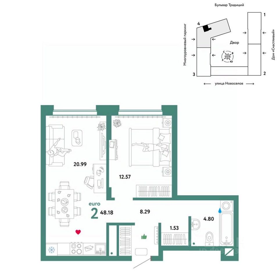 Продается 2комнатная квартира на 2 этаже от застройщика Страна Девелопмент. Площадь квартиры 48,18 кв. м.