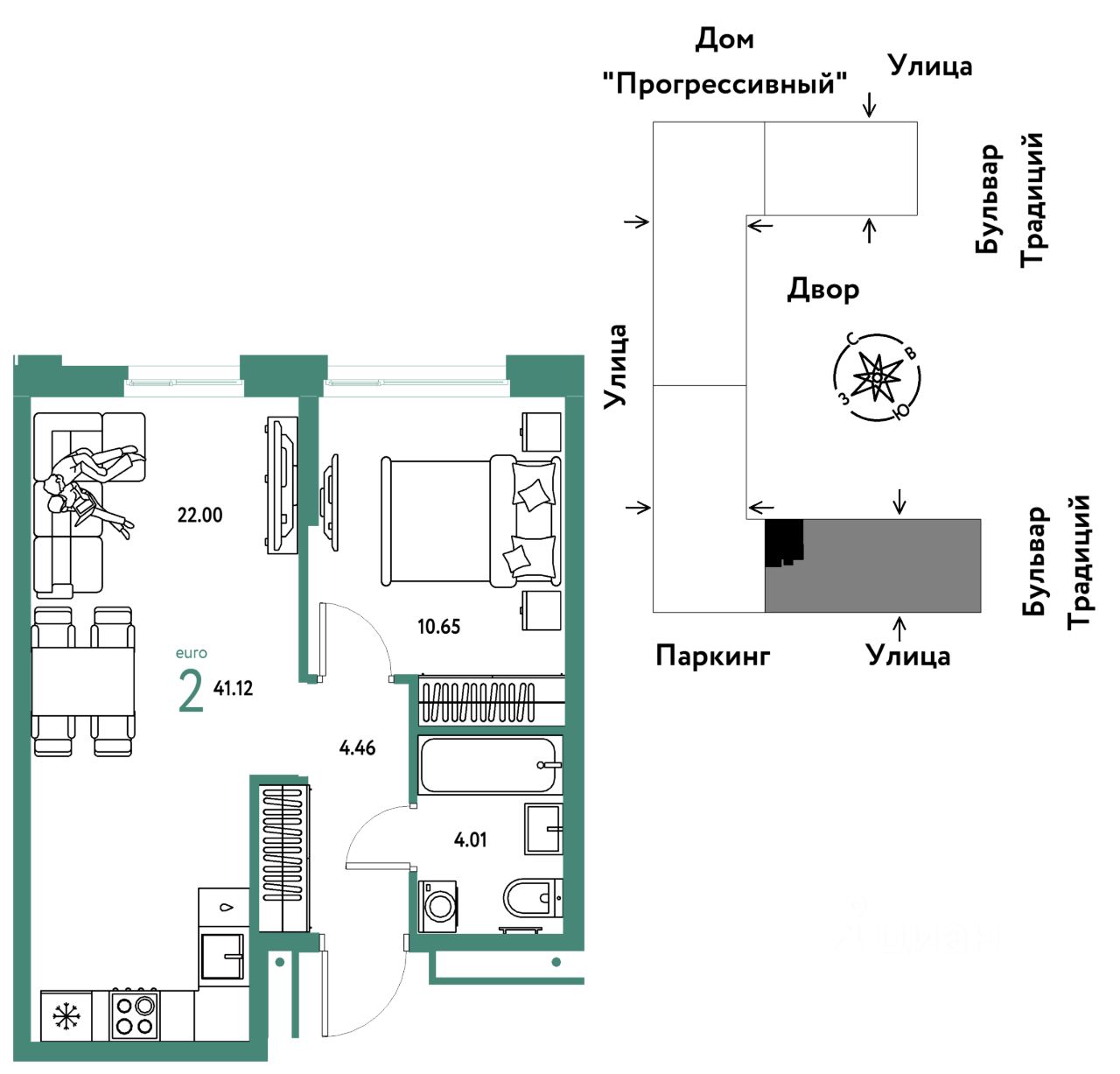 Продается 2комнатная квартира на 5 этаже от застройщика Страна Девелопмент. Площадь квартиры 41,12 кв. м.