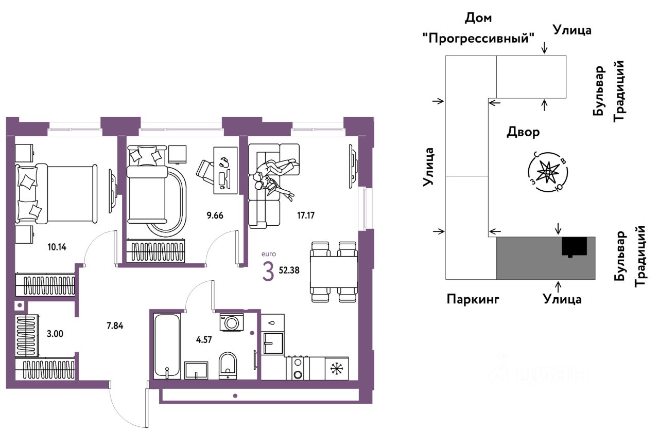Продается 3комнатная квартира на 13 этаже от застройщика Страна Девелопмент. Площадь квартиры 52,38 кв. м.