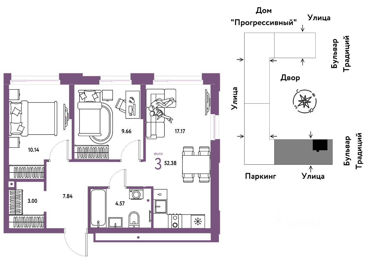 Продается 3комнатная квартира на 14 этаже от застройщика Страна Девелопмент. Площадь квартиры 52,38 кв. м.