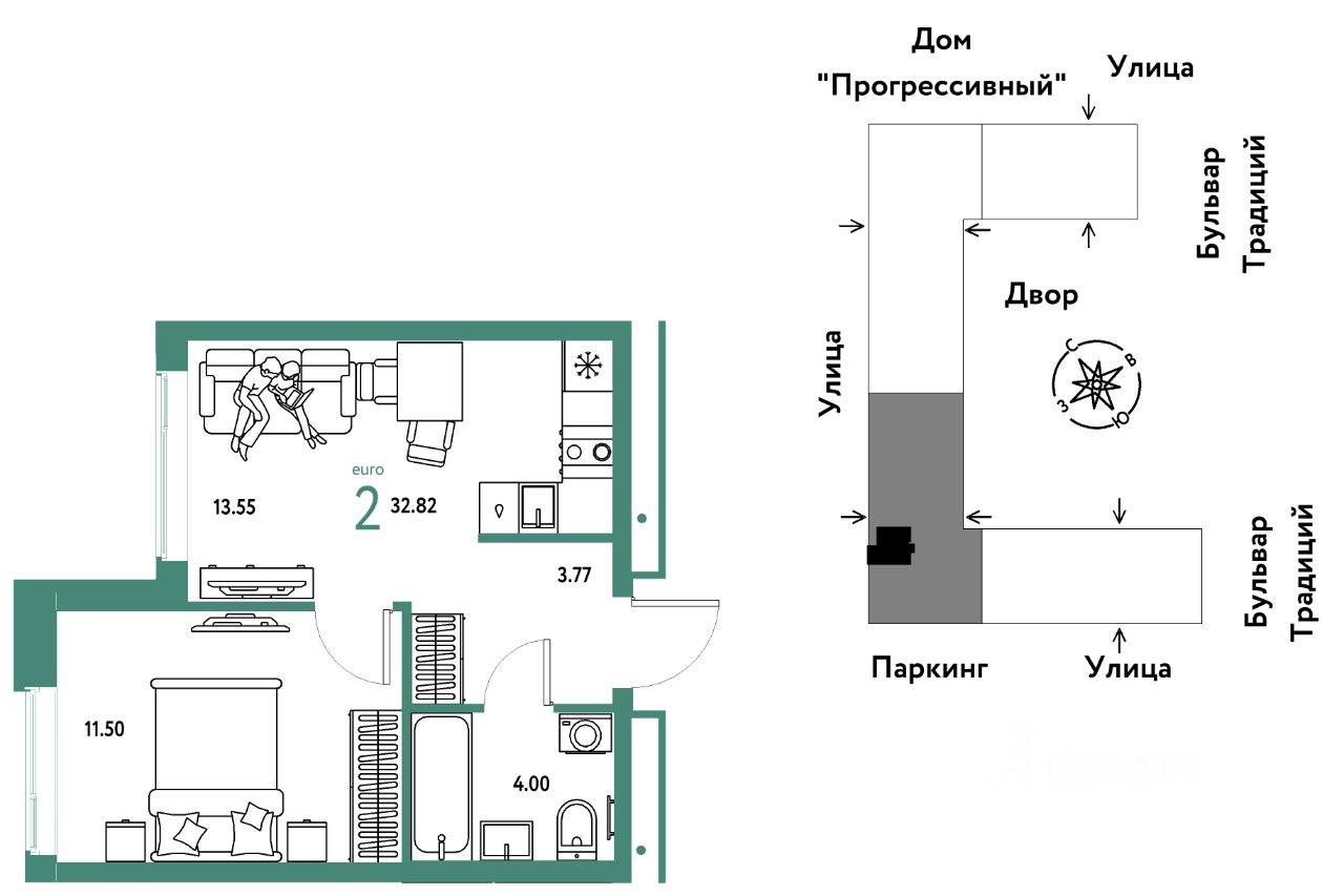 Продается 2комнатная квартира на 3 этаже от застройщика Страна Девелопмент. Площадь квартиры 32,82 кв. м.