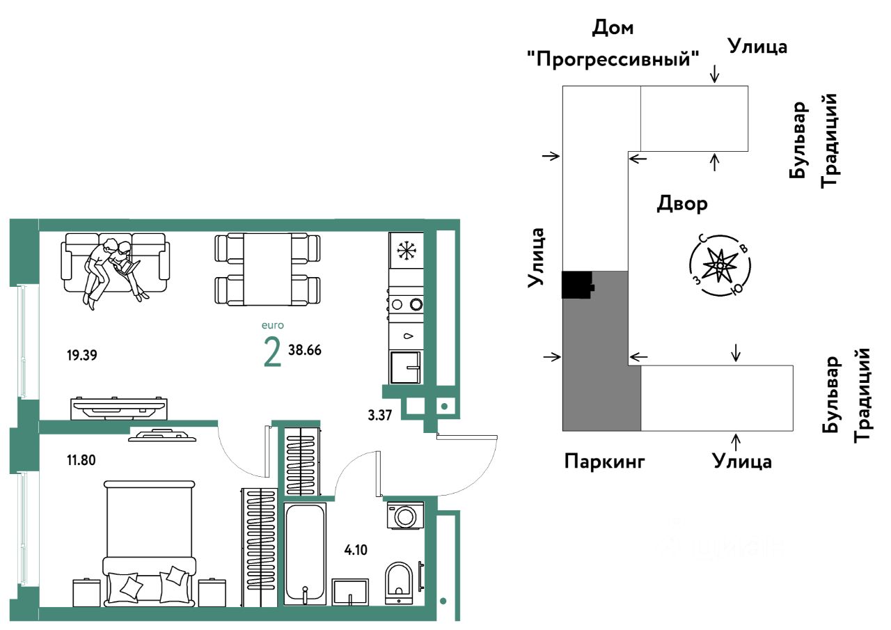 Продается 2комнатная квартира на 3 этаже от застройщика Страна Девелопмент. Площадь квартиры 38,66 кв. м.