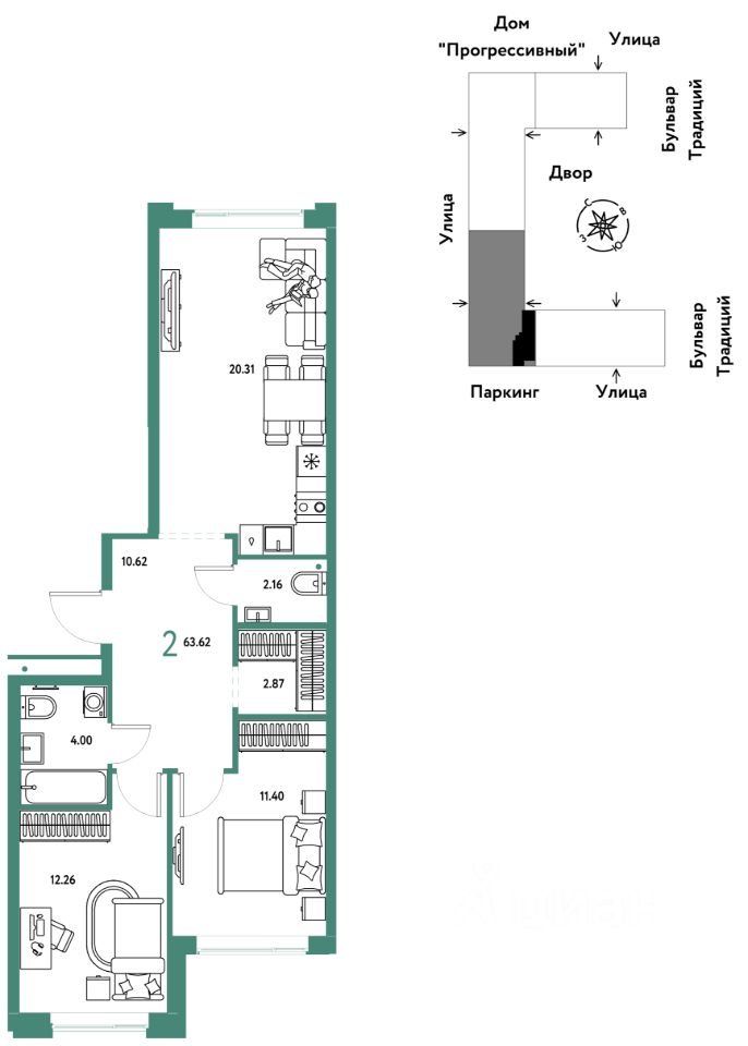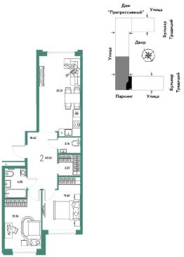 Продается 2комнатная квартира на 5 этаже от застройщика Страна Девелопмент. Площадь квартиры 63,62 кв. м.