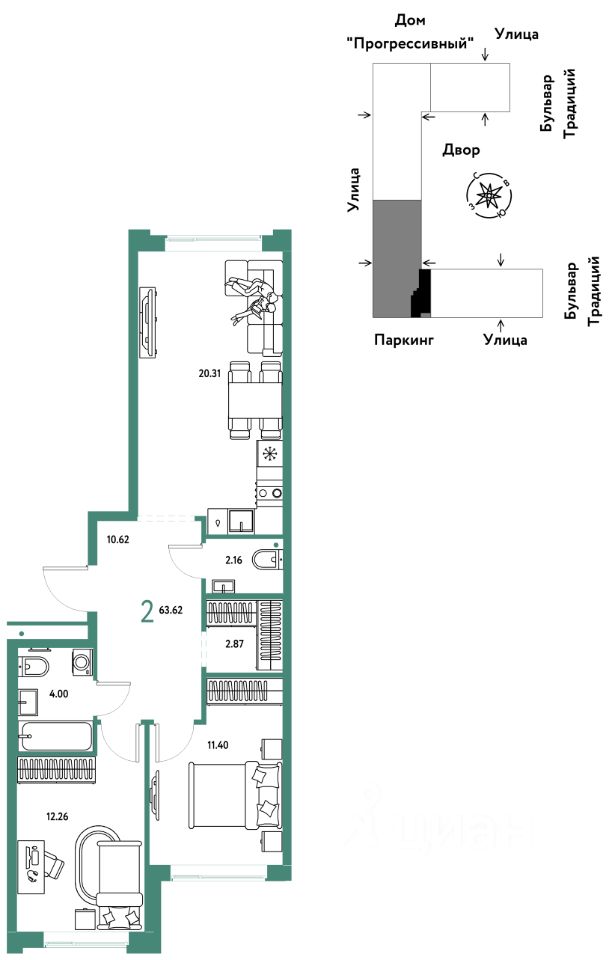Продается 2комнатная квартира на 8 этаже от застройщика Страна Девелопмент. Площадь квартиры 63,62 кв. м.