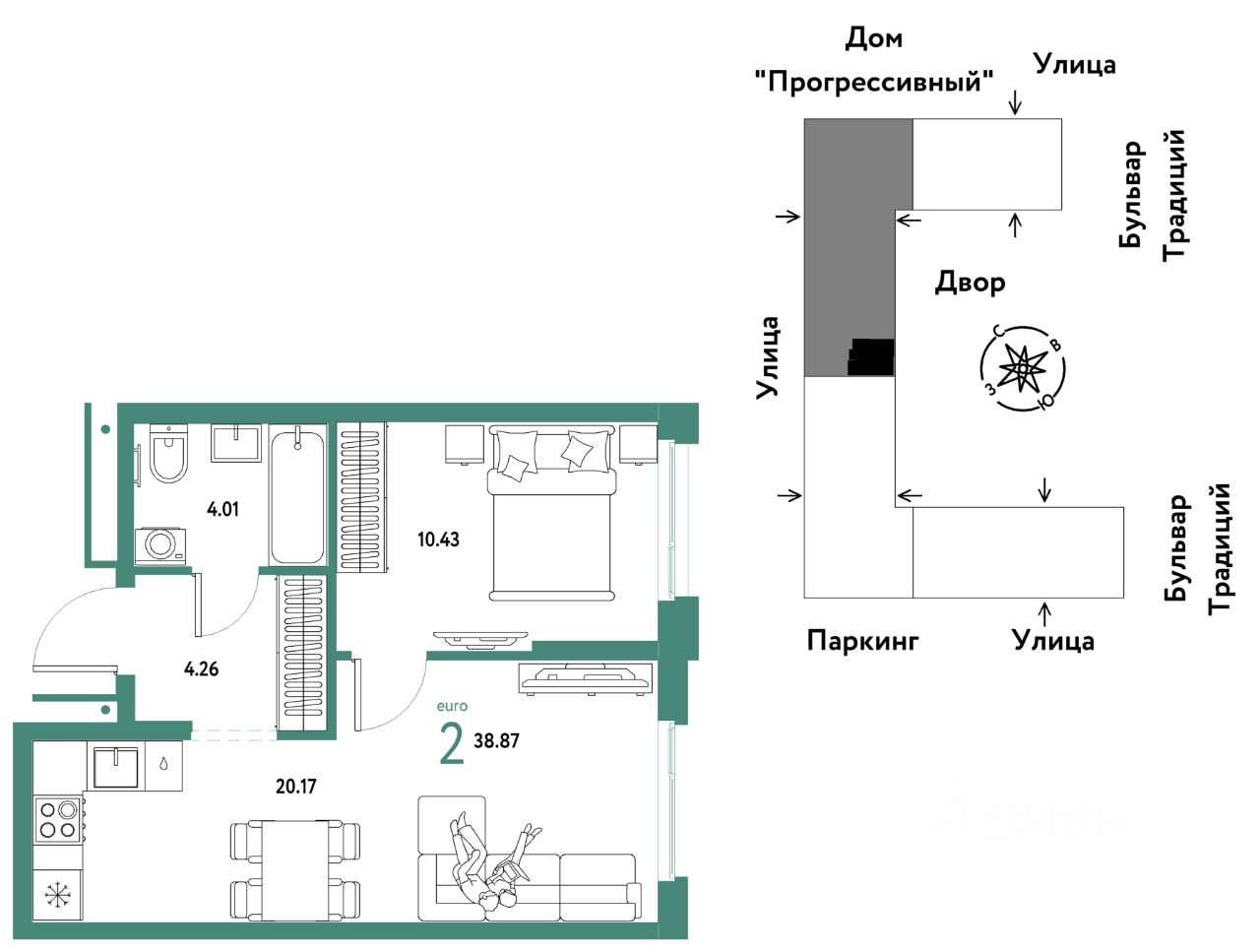 Продается 2комнатная квартира на 2 этаже от застройщика Страна Девелопмент. Площадь квартиры 38,87 кв. м.