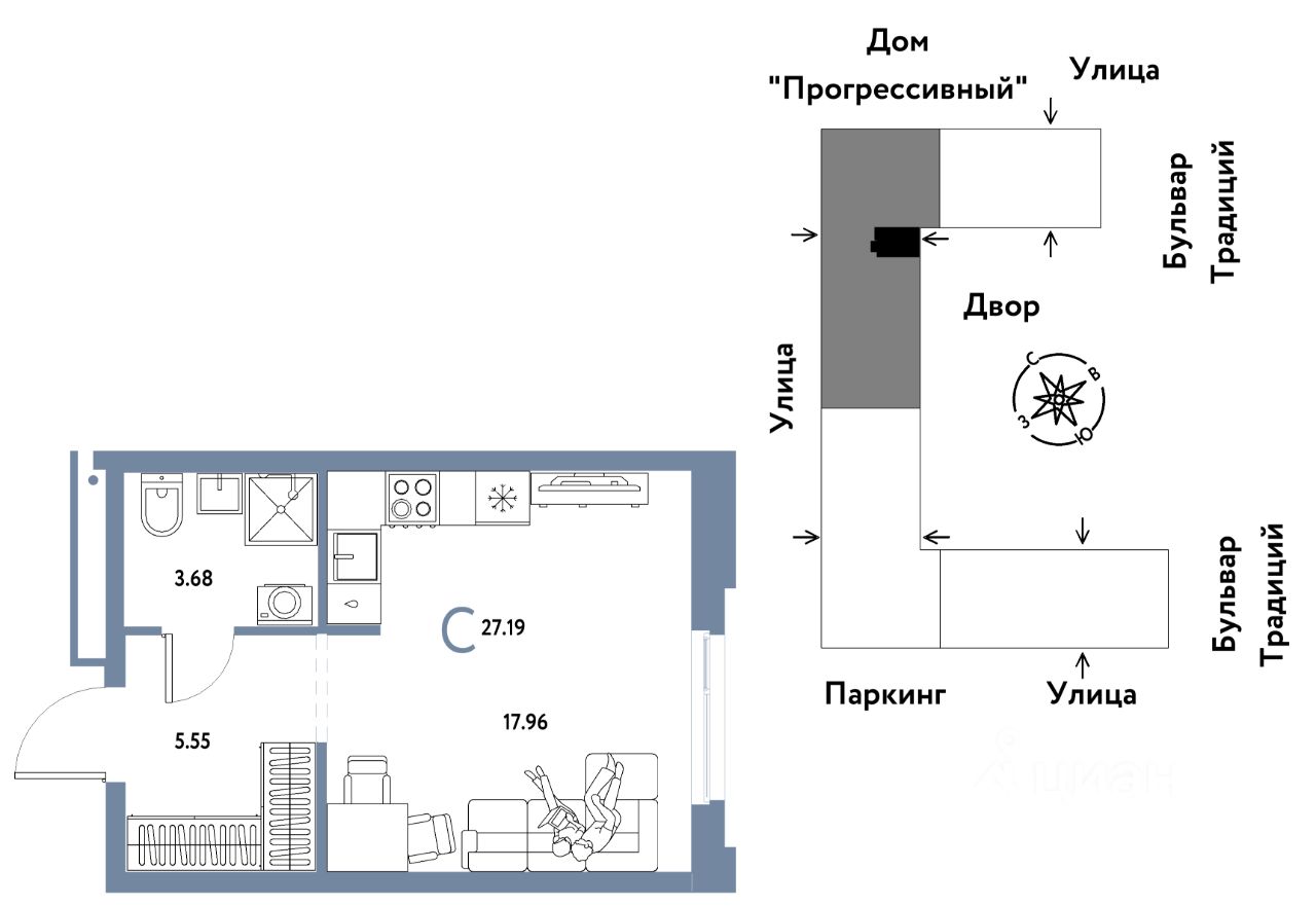 Продается 1комнатная квартира на 8 этаже от застройщика Страна Девелопмент. Площадь квартиры 27,19 кв. м.