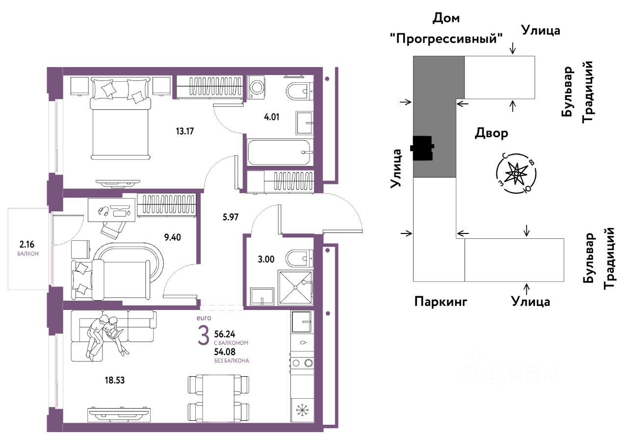 Продается 3комнатная квартира на 9 этаже от застройщика Страна Девелопмент. Площадь квартиры 56,24 кв. м.
