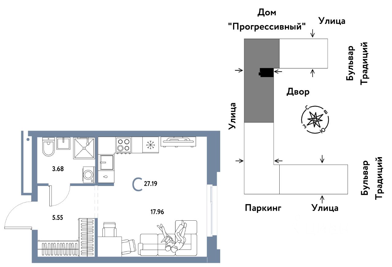 Продается 1комнатная квартира на 12 этаже от застройщика Страна Девелопмент. Площадь квартиры 27,19 кв. м.
