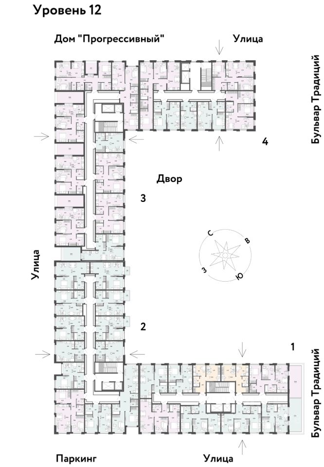 -Сквозные парадные с прозрачными входными группами, колясочными и велосипедными