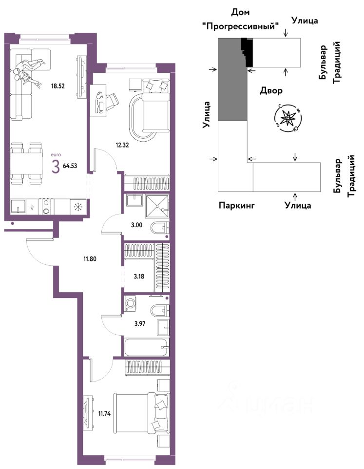 Продается 3комнатная квартира на 12 этаже от застройщика Страна Девелопмент. Площадь квартиры 64,53 кв. м.