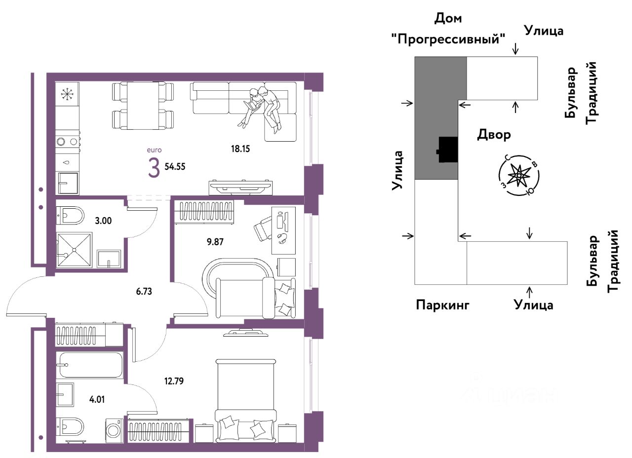 Продается 3комнатная квартира на 13 этаже от застройщика Страна Девелопмент. Площадь квартиры 54,55 кв. м.