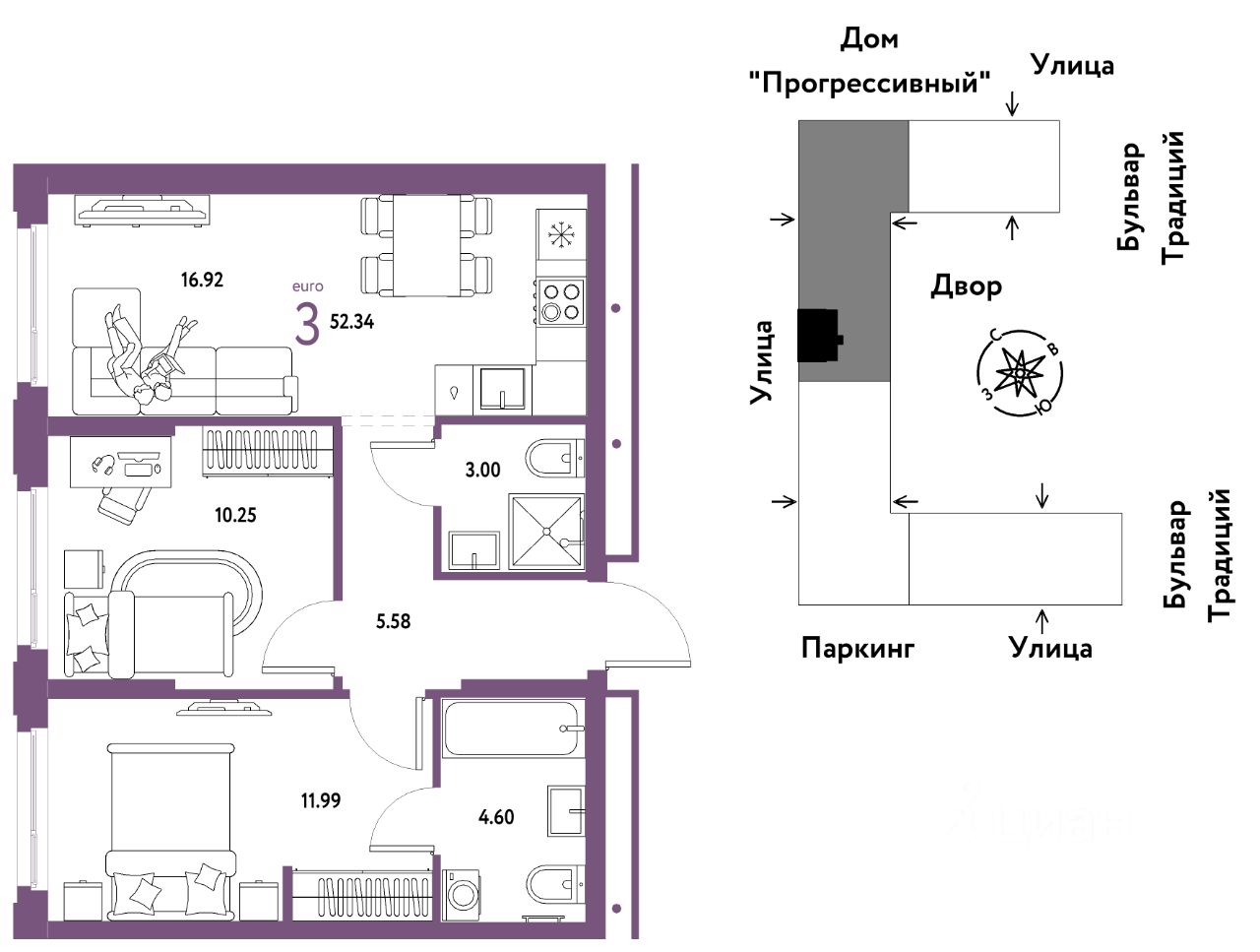 Продается 3комнатная квартира на 13 этаже от застройщика Страна Девелопмент. Площадь квартиры 52,34 кв. м.