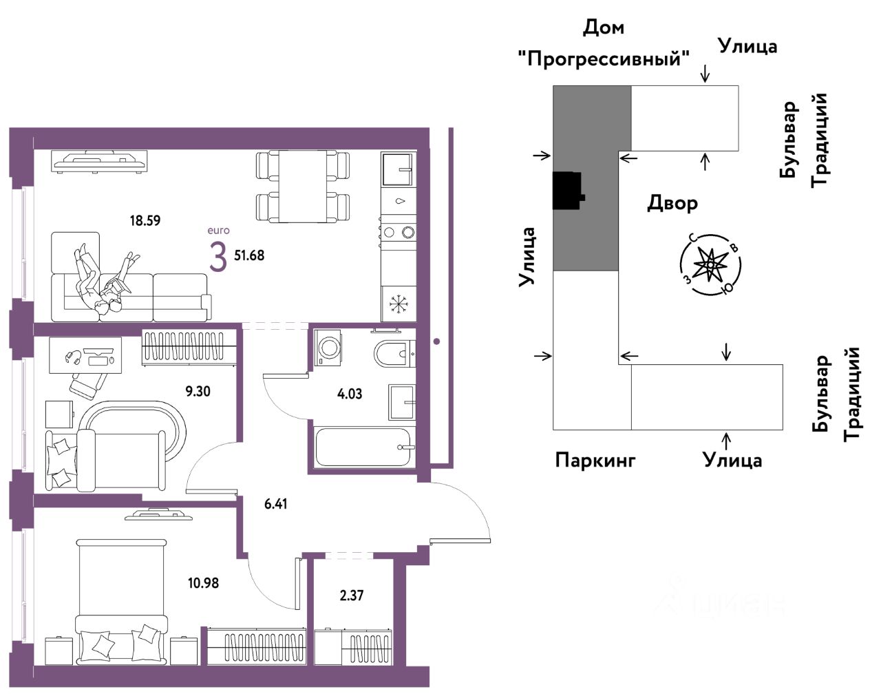 Продается 3комнатная квартира на 13 этаже от застройщика Страна Девелопмент. Площадь квартиры 51,68 кв. м.