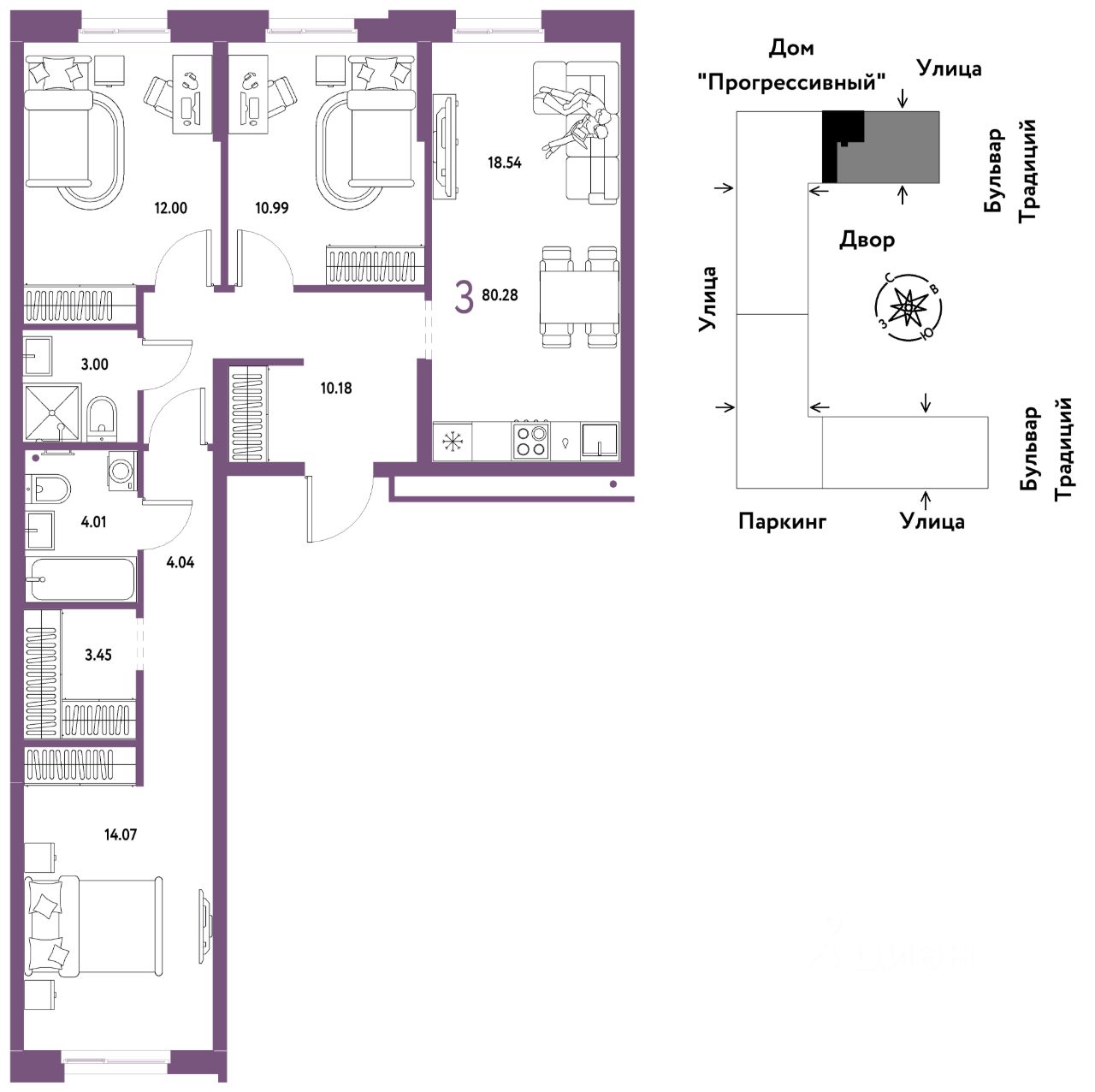 Продается 3комнатная квартира на 4 этаже от застройщика Страна Девелопмент. Площадь квартиры 80,28 кв. м.