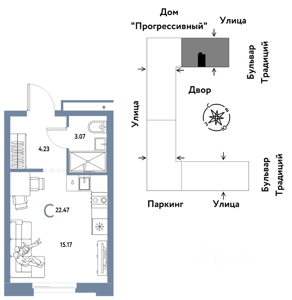 Продается 1комнатная квартира на 7 этаже от застройщика Страна Девелопмент. Площадь квартиры 22,47 кв. м.