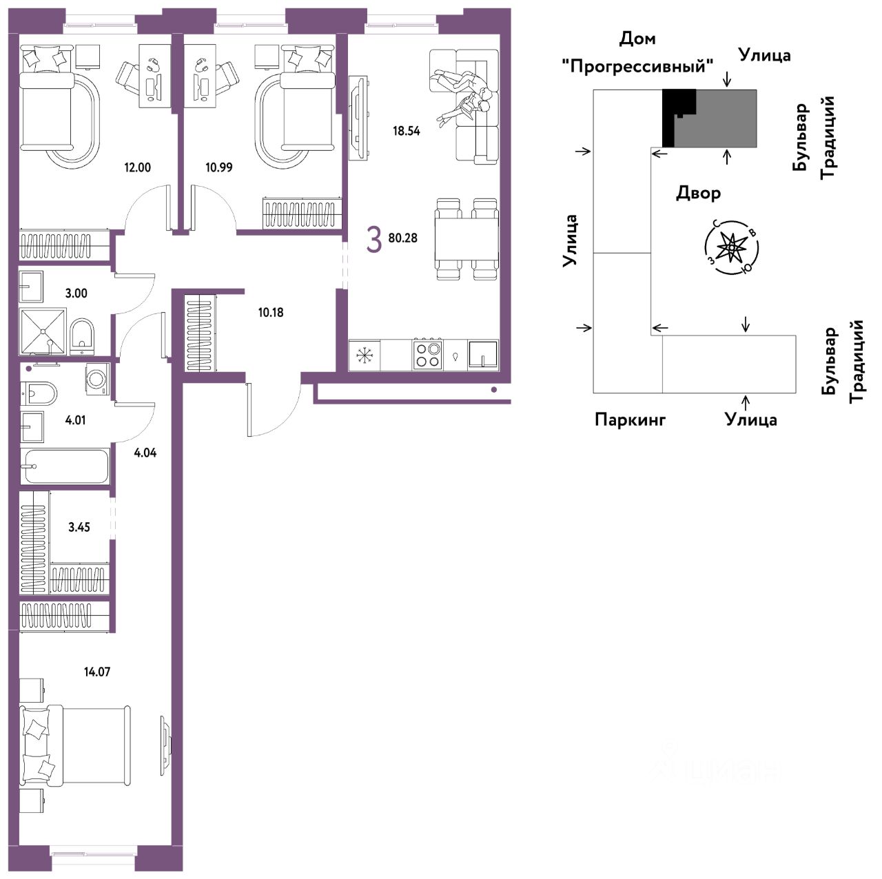 Продается 3комнатная квартира на 9 этаже от застройщика Страна Девелопмент. Площадь квартиры 80,28 кв. м.