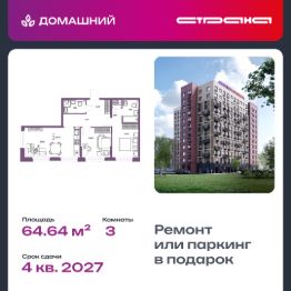 Продается 3комнатная квартира на 2 этаже от застройщика Страна Девелопмент. Площадь квартиры 64,64 кв. м.