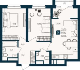 Продаётся 2-комнатная квартира в строящемся доме (Дом Каскад (ГП-2)), срок сдачи: III-кв. 2027, общей площадью 59.14 кв.м., на 20 этаже. Новый жилой комплекс "Квартал Мятный" от Специализированного застройщика "Юпитер" расположен по адресу: г. Тюмень по ул. Кулибина.