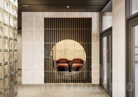В парадных обустроен тёплый тамбур, витражи и перегородки в стиле сёдзи, мягкие зоны ожидания.