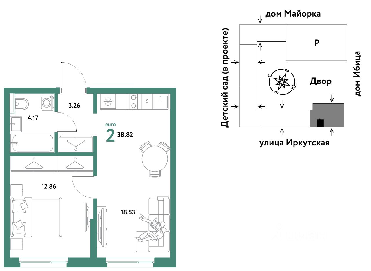 Продается 2комнатная квартира на 2 этаже от застройщика Страна Девелопмент. Площадь квартиры 38,82 кв. м.