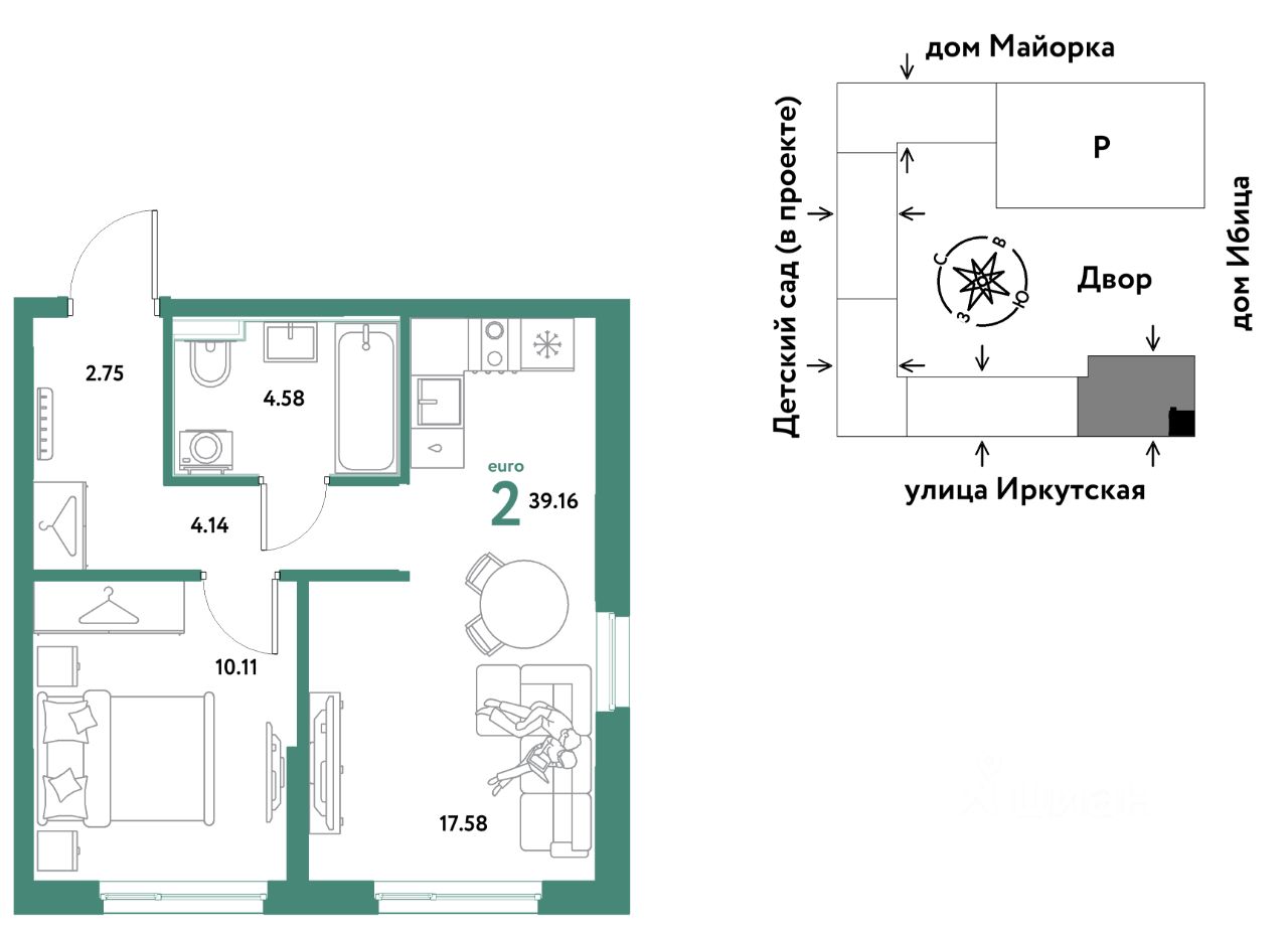 Продается 2комнатная квартира на 4 этаже от застройщика Страна Девелопмент. Площадь квартиры 39,16 кв. м.