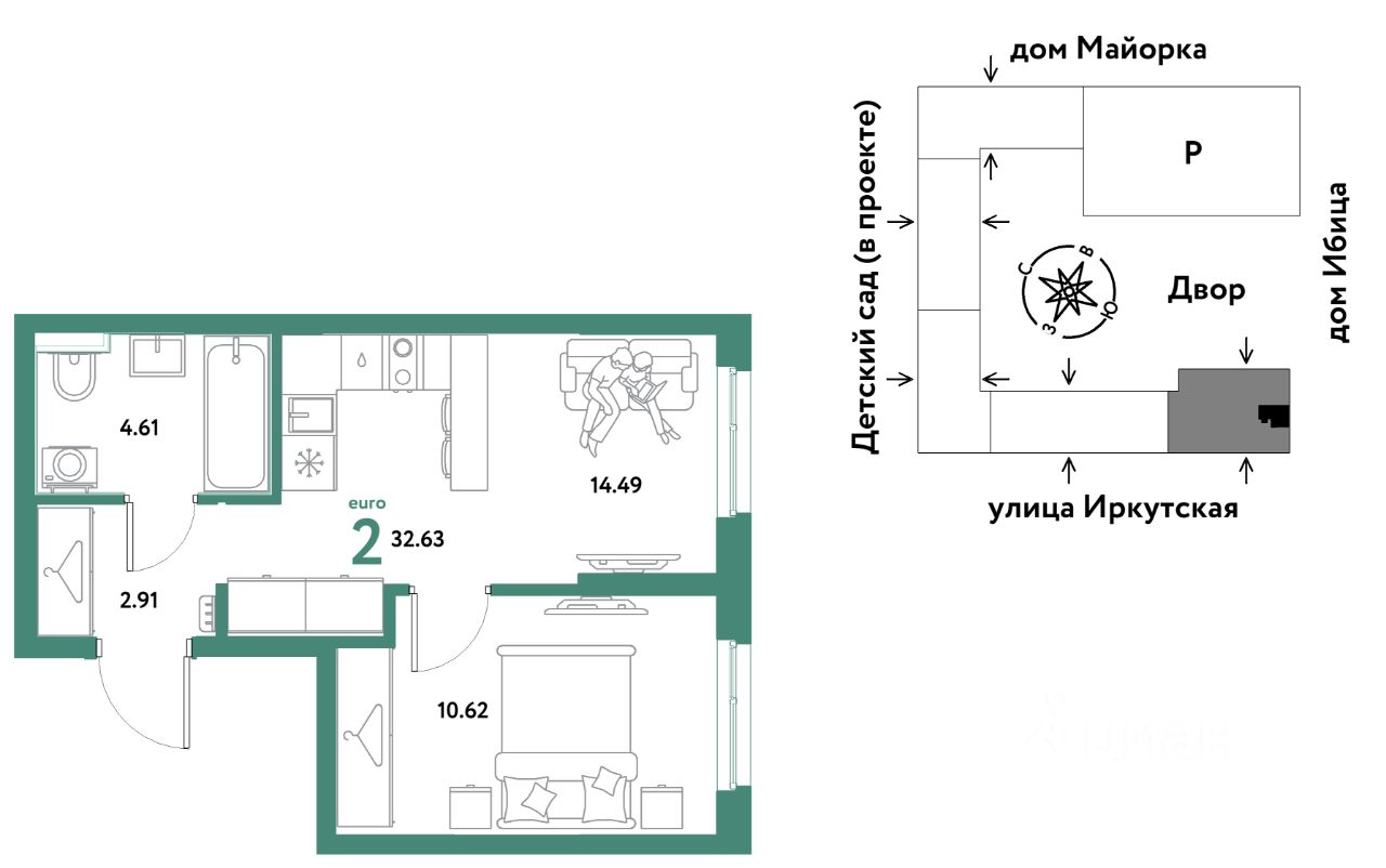 Продается 2комнатная квартира на 9 этаже от застройщика Страна Девелопмент. Площадь квартиры 32,63 кв. м.