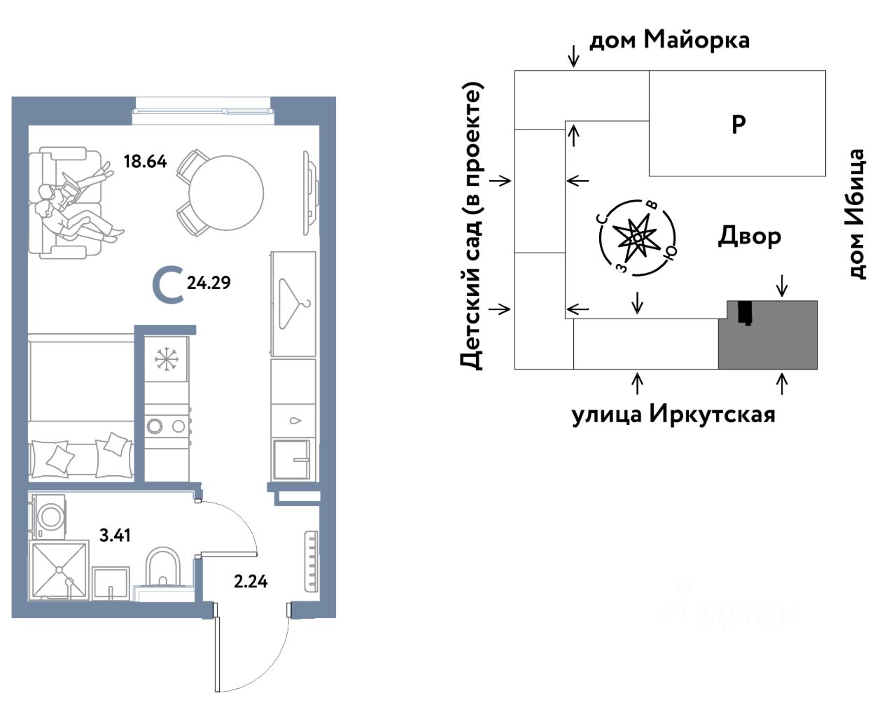 Продается квартира-студия на 13 этаже от застройщика Страна Девелопмент. Площадь квартиры 24,29 кв. м.