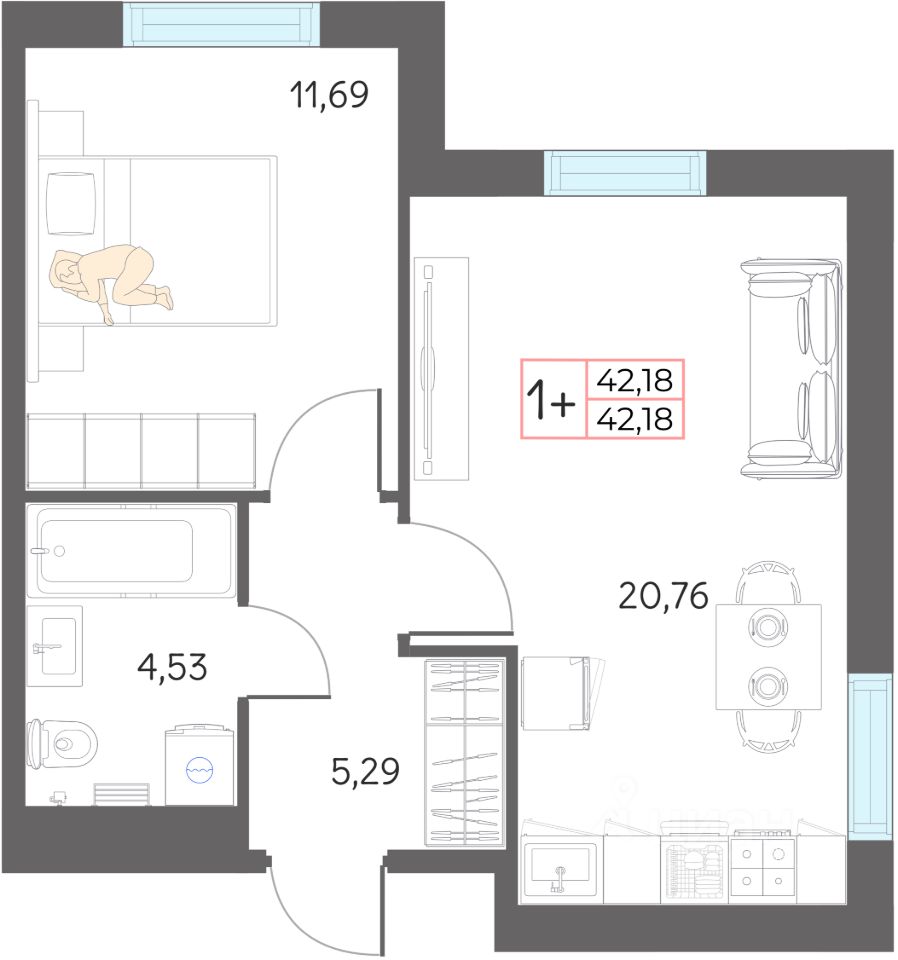 Продаётся 1-комнатная квартира в строящемся доме (ГП-1 (Дом 29)), срок сдачи: I-кв. 2027, общей площадью 42.18 кв.м., на 1 этаже. Рассвет в Тобольске - это жилой комплекс из 4 домов, расположенный в границах улиц Нефтехимиков и Александра Абдулова, созданный для семейного проживания.