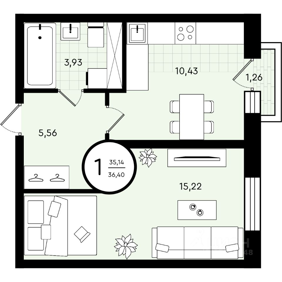 Общая площадь36,4 м²