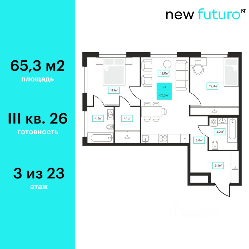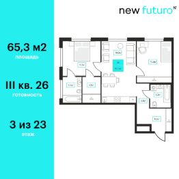 Продаётся 2-комнатная квартира в строящемся доме (Дом 6к1), срок сдачи: III-кв. 2026, общей площадью 65.3 кв.м., на 3 этаже. Новый жилой комплекс "Futuro" от застройщика "newton" расположен в г. Тюмень на Ставропольской улице.