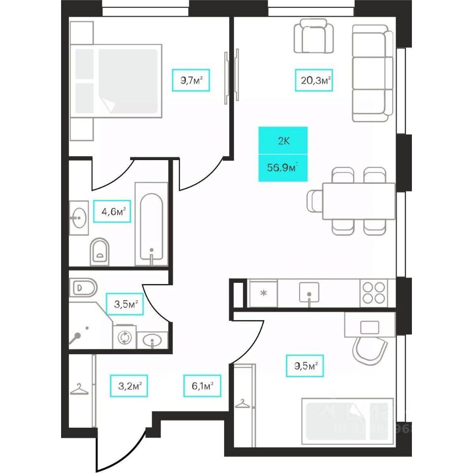 56,9 м²