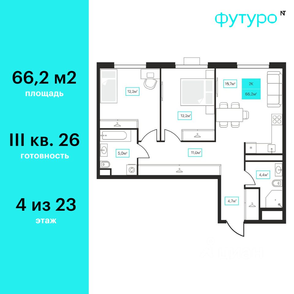 Продаётся 2-комнатная квартира в строящемся доме (Дом 6к1), срок сдачи: III-кв. 2026, общей площадью 66.2 кв.м., на 4 этаже. Новый жилой комплекс "Futuro" от застройщика "newton" расположен в г. Тюмень на Ставропольской улице.