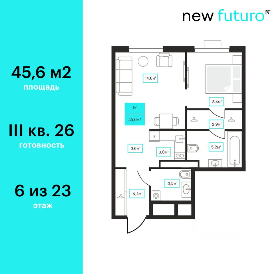 Продаётся 1-комнатная квартира в строящемся доме (Дом 6к1), срок сдачи: III-кв. 2026, общей площадью 45.6 кв.м., на 6 этаже. Новый жилой комплекс "Futuro" от застройщика "newton" расположен в г. Тюмень на Ставропольской улице.