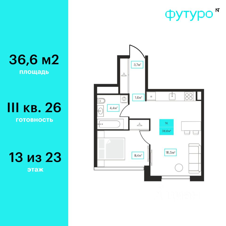 Продаётся 1-комнатная квартира в строящемся доме (Дом 6к1), срок сдачи: III-кв. 2026, общей площадью 36.6 кв.м., на 13 этаже. Новый жилой комплекс "Futuro" от застройщика "newton" расположен в г. Тюмень на Ставропольской улице.