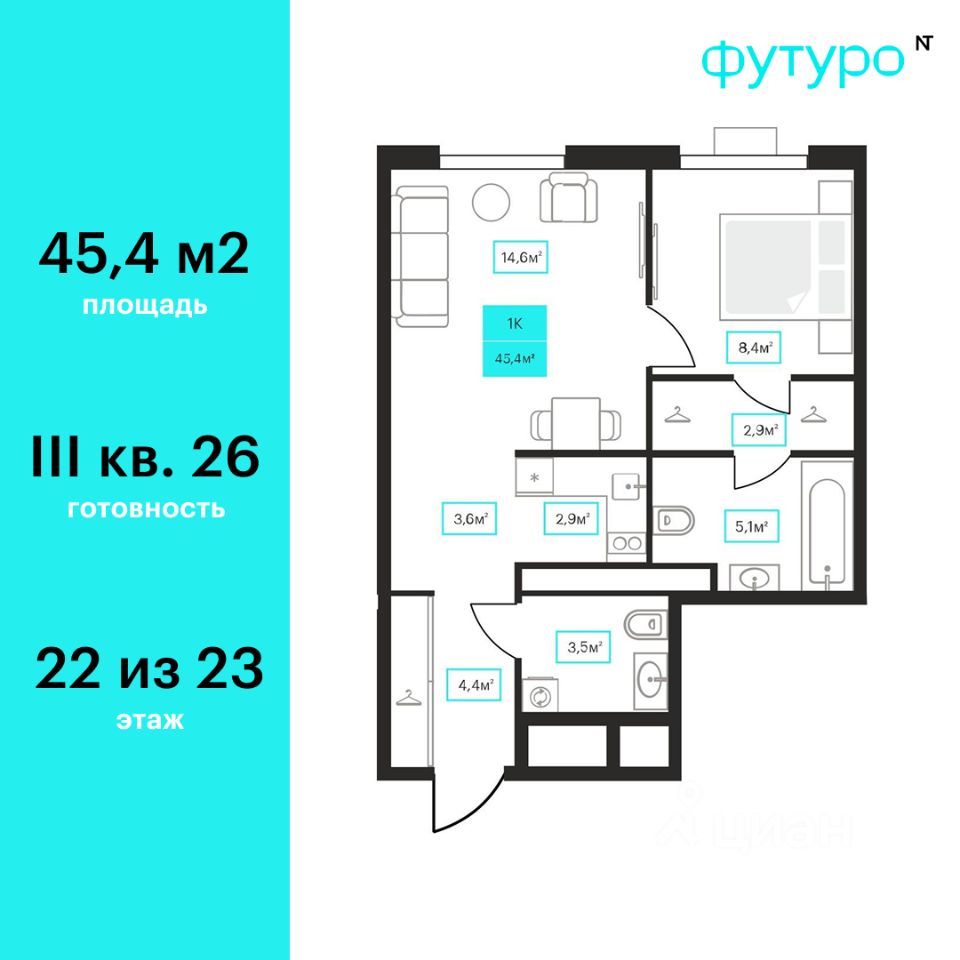 Продаётся 1-комнатная квартира в строящемся доме (Дом 6к1), срок сдачи: III-кв. 2026, общей площадью 45.4 кв.м., на 22 этаже. Новый жилой комплекс "Futuro" от застройщика "newton" расположен в г. Тюмень на Ставропольской улице.
