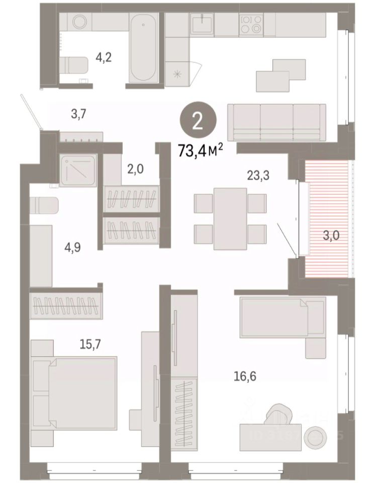 Квартира с кухней-гостиной и двумя спальнями в кварталах "На Минской". Особенности планировки: гардеробная, вид во двор, лоджия, предчистовая отделка, мастер-спальня.