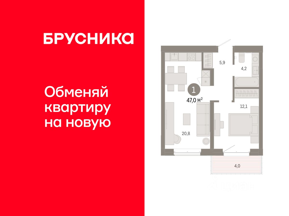 Квартира с кухней-гостиной и одной спальней в кварталах "На Минской". Особенности планировки: балкон, предчистовая отделка.