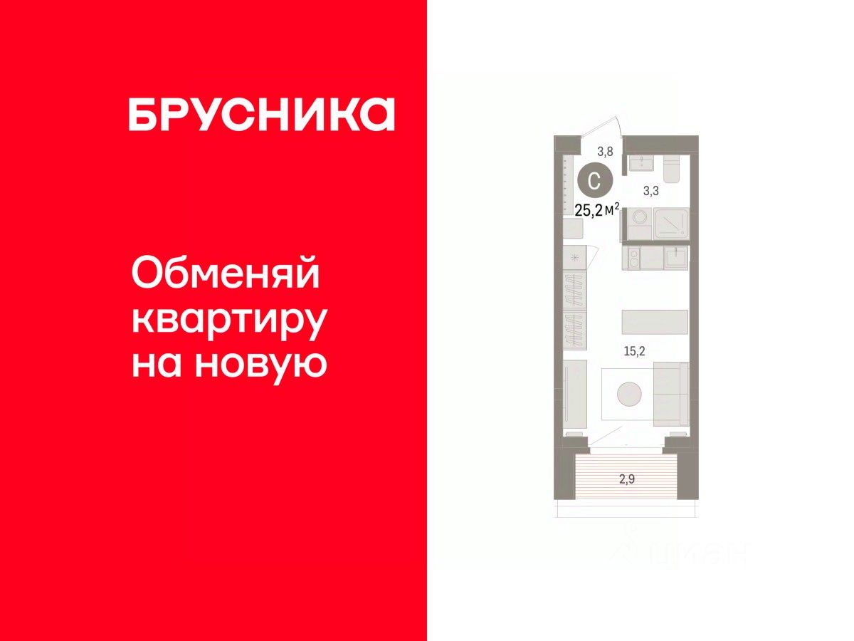 1-комн. студия с предчистовой отделкой в Кварталы "На Минской" на 9 этаже. Общая площадь: 25.16 кв.м., площадь гостиной 15.2 кв.м., из которых 5 кв.м. выделено под кухонную зону. Все окна выходят на одну сторону. В квартире один балкон, один совмещенный санузел. Высота потолков 2.7 м.