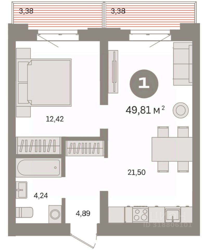 Квартира с кухней-гостиной и одной спальней в жилом районе "Речной порт". Особенности планировки: вид во двор, предчистовая отделка, балкон.