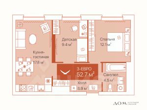 Планировка с двумя отдельным спальнями. Кухня-гостиная и спальня с увеличенными окнами. В холле просторно — есть ниша под шкаф.
